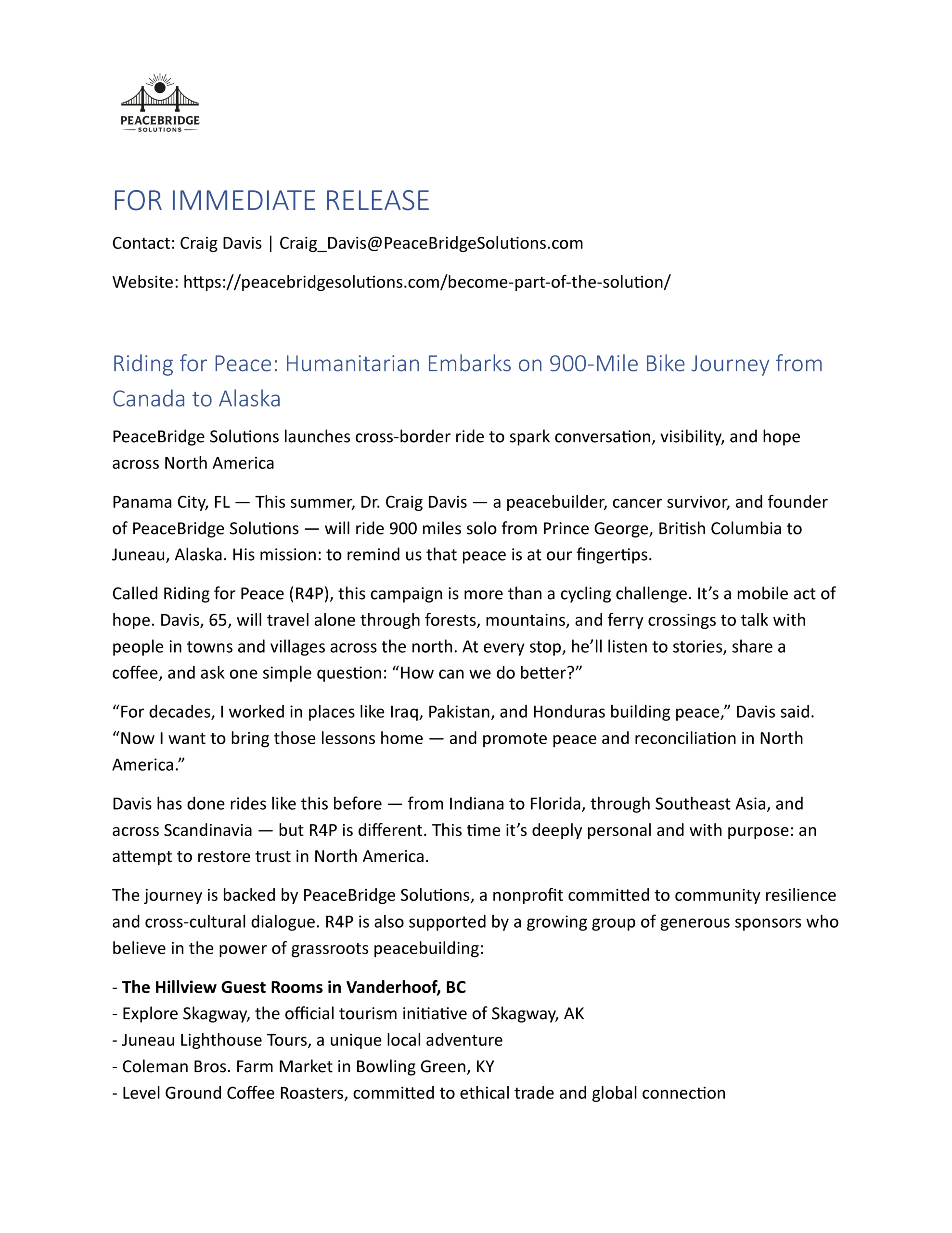 After a long career in humanitarian work overseas, I launched PeaceBridge Solutions in March 2025 to foster Community Action across North America and beyond.